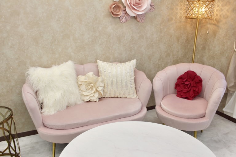 ・入室直後に視線が向く出入り口突き当りの壁面(ティファニーブルー)と、華やかさが求められる写真撮影スペースとの兼用であるカウンセリングスペースの背後壁面(ゴールド大理石調)には、華やかな印象のアクセントクロスをご提案致しました。